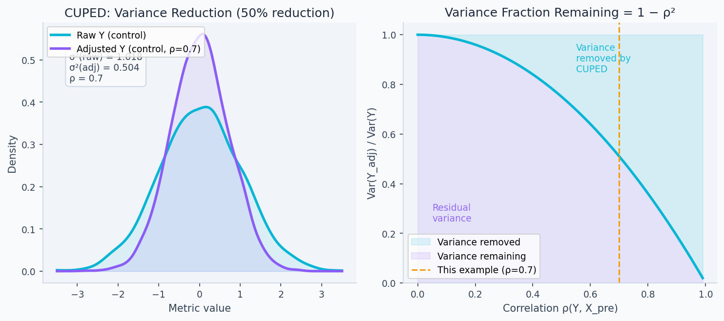 Same required number of standard errors, 64% less variance → 64% fewer users needed → 64% shorter experiment. The left panel below shows exactly this: the adjusted distribution is narrower, concentrating more probability mass near the true mean. The right panel shows that the variance remaining grows rapidly as falls — if your pre-experiment covariate has no predictive power, CUPED doesn't help.