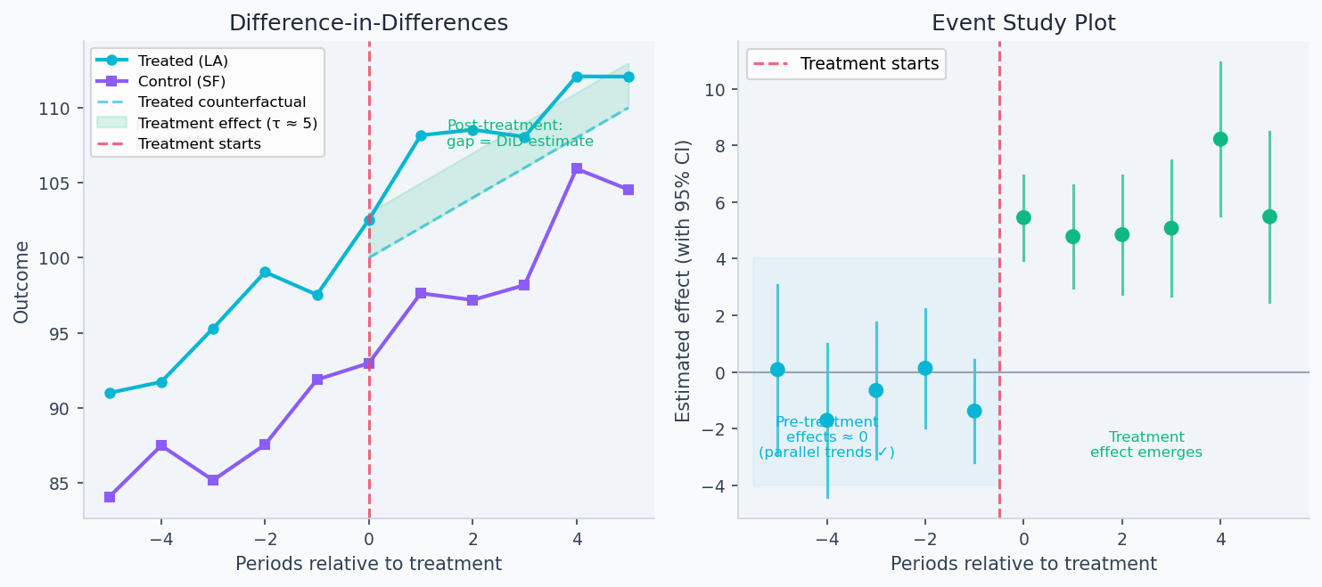 The left panel below shows DiD in action: LA and SF track each other closely before the launch (parallel trends holds), then LA diverges post-treatment while SF continues on the same trajectory — the gap is the causal estimate. The right panel shows an event study: pre-treatment coefficients all near zero validate parallel trends, while post-treatment coefficients reveal the treatment effect emerging and persisting.