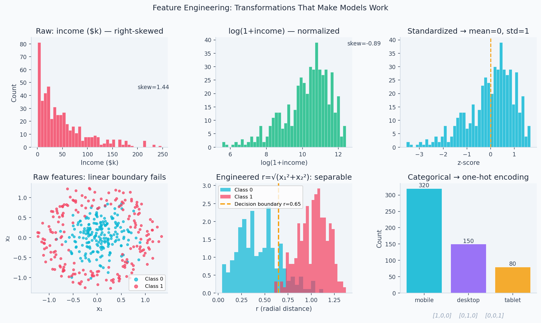 Feature engineering transforms raw input into a richer representation where . The goal: make the relationship between features and target more linear and separable for downstream models.