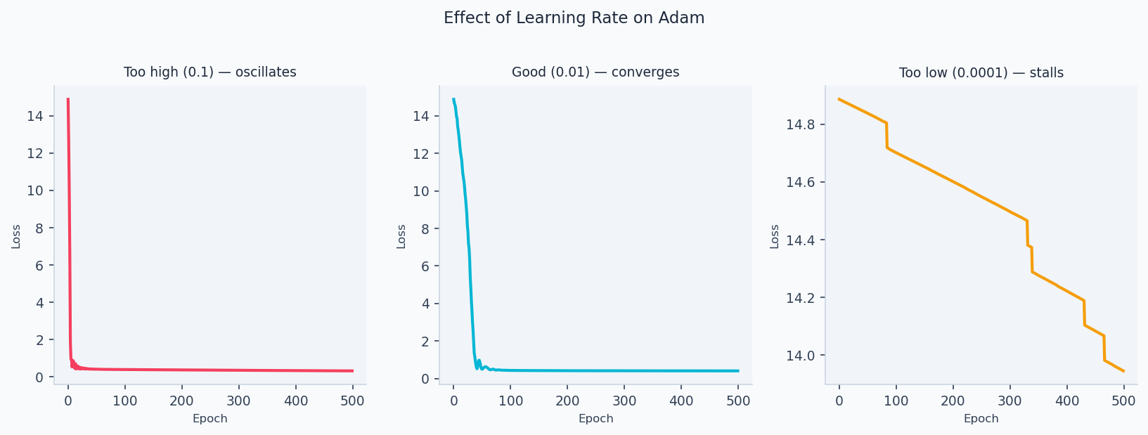 | Too high | Loss spikes, oscillates, or NaN | Reduce by 10× |