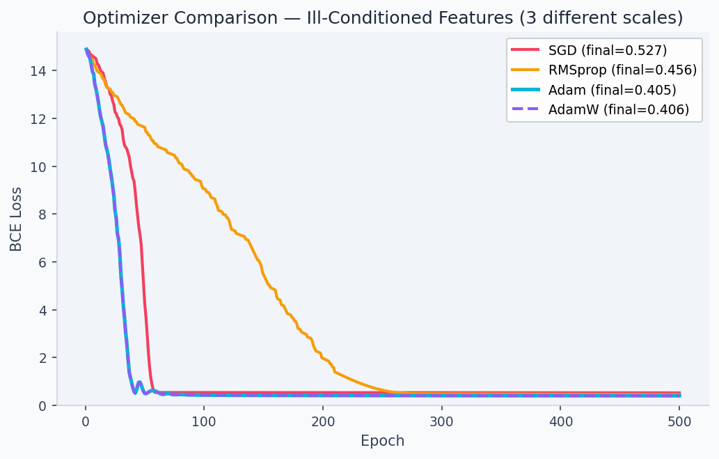 print(f"Adam final loss: {adam_loss:.4f}") # ~0.05 (well converged)Adam converges ~10× faster on ill-conditioned problems because it normalizes gradients per-parameter.