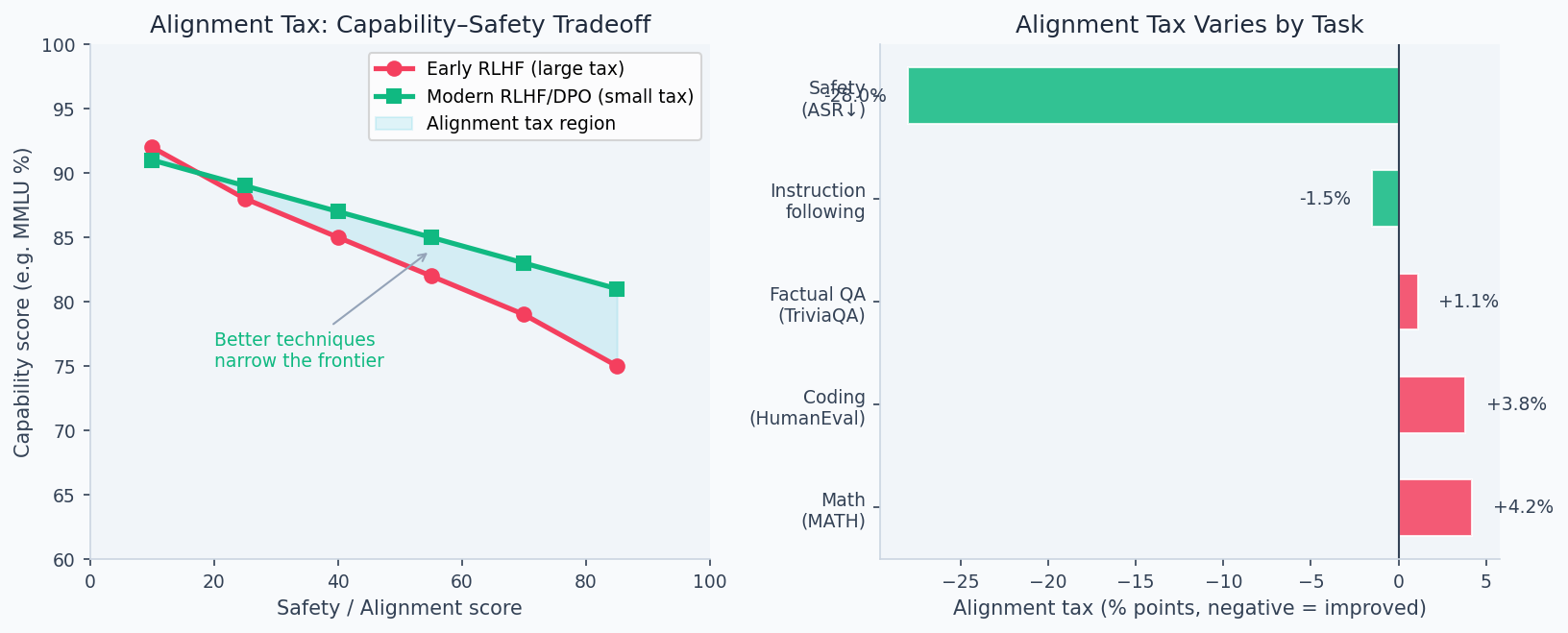 - Constitutional AI and Direct Preference Optimization (DPO) typically incur smaller taxes than full Reinforcement Learning from Human Feedback (RLHF)-PPO