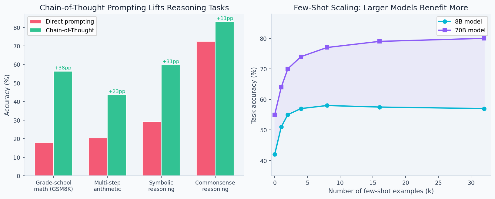 Prompt engineering is the fastest path to better model performance without retraining. On GSM8K (math word problems), simply adding "Let's think step by step" improves accuracy from 56% to 93% — a 37-point gain from four words. In practice, prompt engineering is how teams iterate on new product features before committing to fine-tuning: build a working prototype with the right prompt, measure it, then decide if fine-tuning is worth the cost. Understanding the math of why CoT works (decomposing reasoning steps, using the context window as scratchpad) lets you apply it reliably rather than treating it as magic. This lesson covers few-shot prompting, chain-of-thought, structured output constraints, and prompt robustness testing.