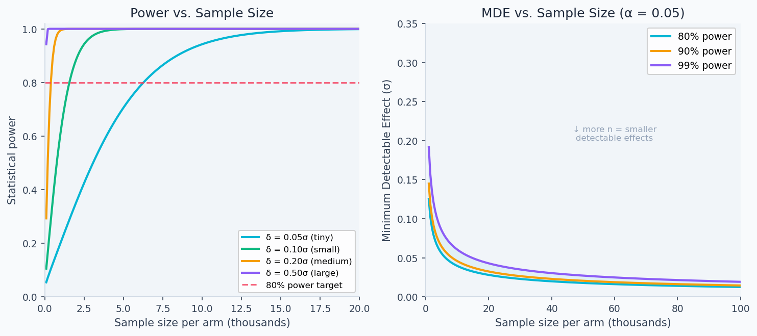 The left panel shows that detecting a 5% relative lift on a metric with high variance requires orders of magnitude more users than detecting a 50% lift. The right panel shows the MDE as a function of sample size — investing in more traffic directly shrinks the smallest effect you can reliably detect.