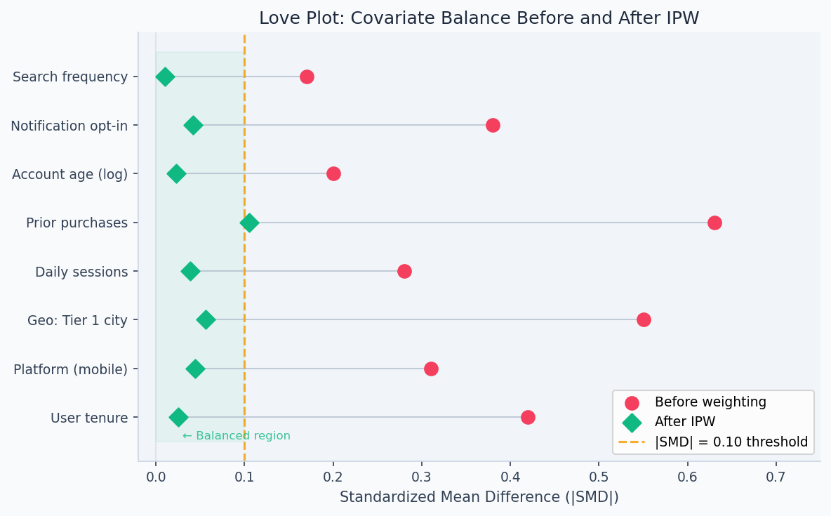 After fitting IPW weights, the standard diagnostic is a Love plot — standardized mean differences (SMD) for each covariate before and after weighting. Values below |SMD| = 0.10 indicate good balance. The figure below shows what successful IPW looks like: pre-weighting SMDs as high as 0.63 on "prior purchases" collapse to near zero post-weighting across all features.